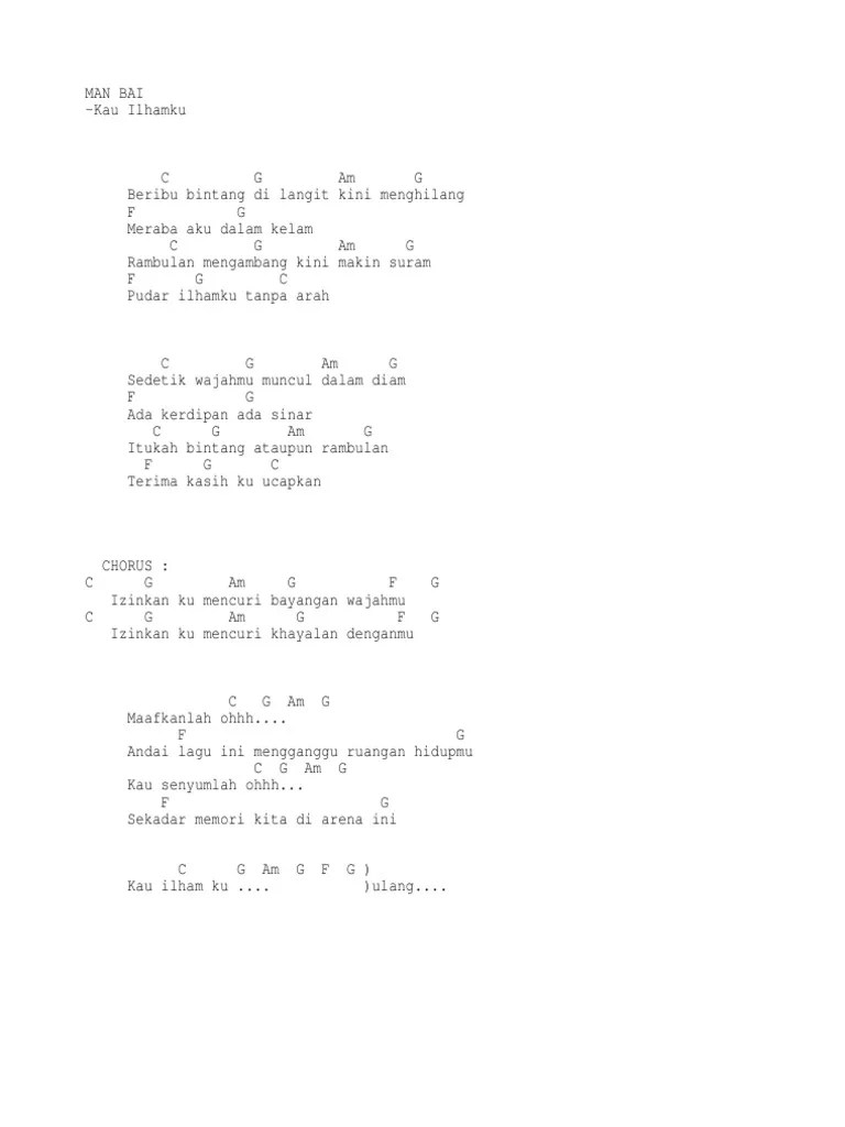 Mencintaiku apa adanya reff c g am em diantara beribu bintang . Di antara beribu bintang hanya kaulah yang paling terang C g diantara beribu bintang am em hanya kaulah yang paling terang f c diantara beribu cinta dm g pilihanku hanya kau sayang. chorus c g am em di antara beribu bintang hanya kaulah yang paling terang. F c dm g di antara beribu cinta pilihanku hanya kau sayang interlude: f g c am f g reff female: c g di antara beribu bintang am em . Am em hanya kau lah yang paling terang.